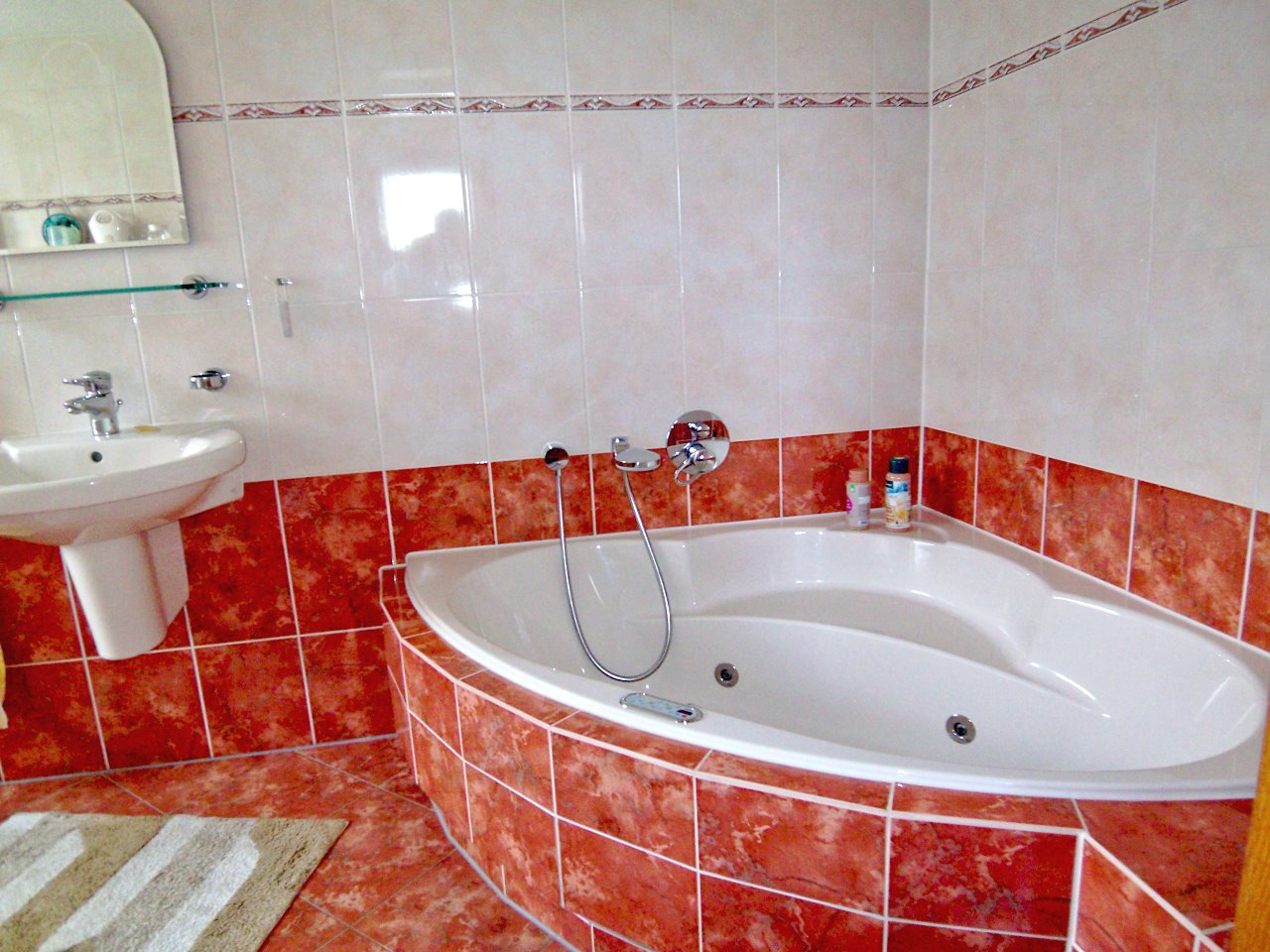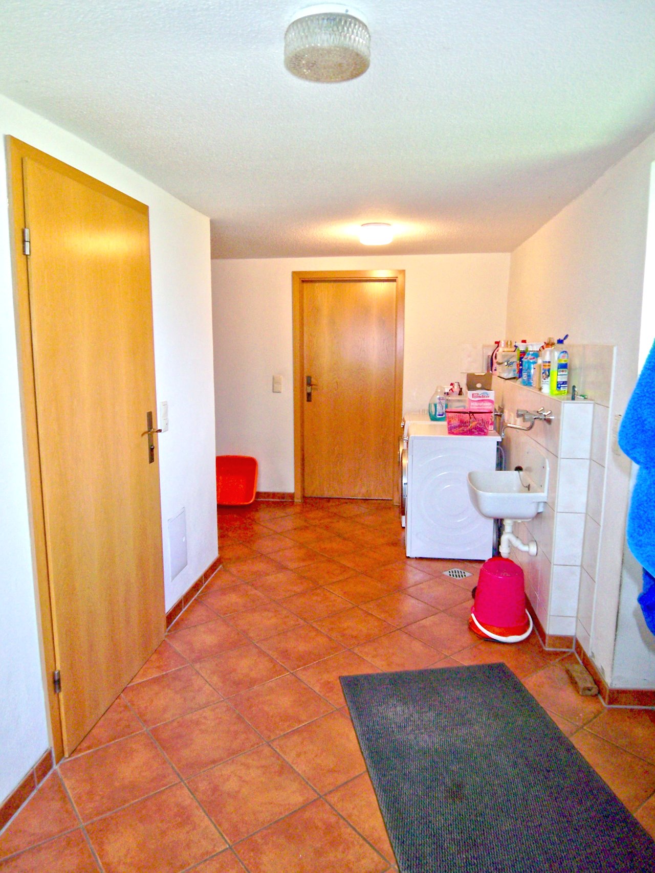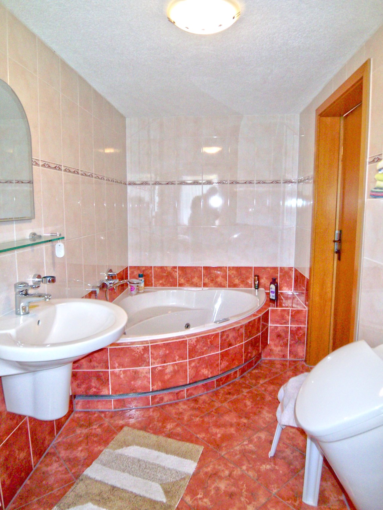 Bad mit Eckbadewanne (Whirlpool), Waschtisch, WC, Pissoir und Handtuchtrockner, Hauswirtschaftsraum mit Sauna und Zugang zum Grundstück, Heizungsraum, Lagerraum mit Zugang zum Grundstück, Diele