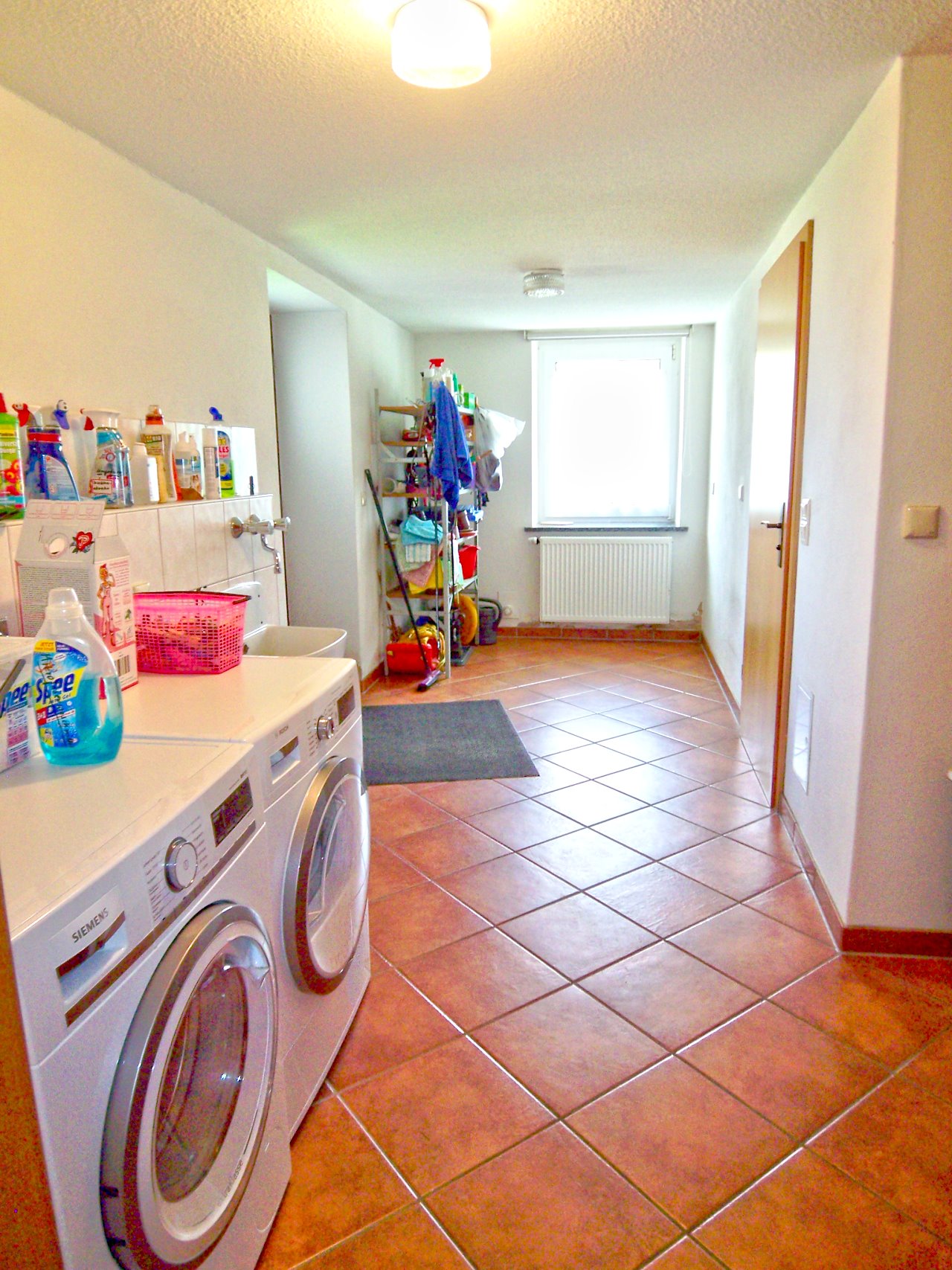 Wohnzimmer mit Kachelofen, Küche mit Einbauküche (VB), Modernes Bad mit Wanne, ebenerdiger Dusche, WC, Waschtisch und Handtuchtrockner, Hauswirtschaftsraum mit Zugang zum Grundstück, Vorratsraum, Diele mit Zugang zum Keller, Flur