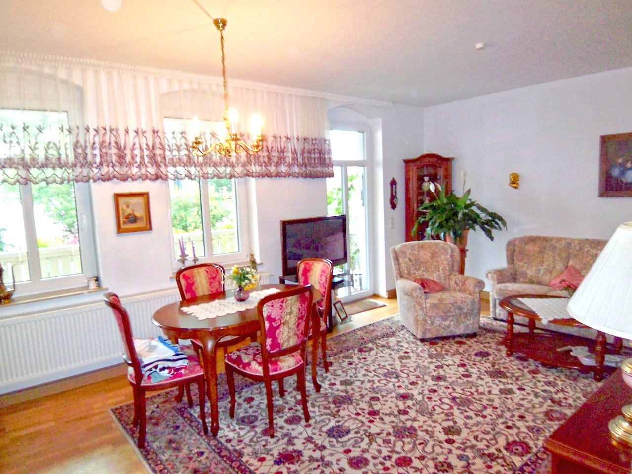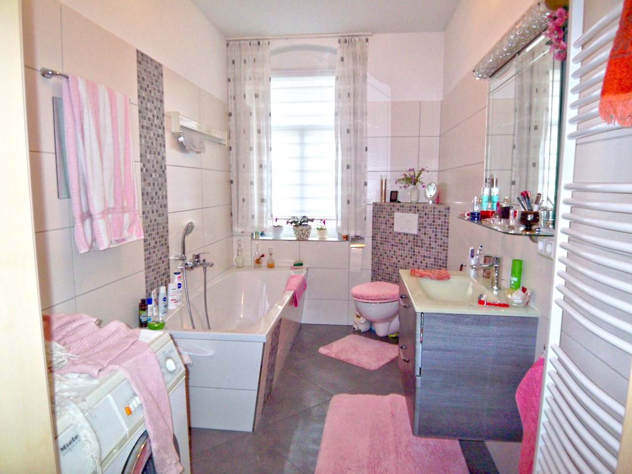 Wohnzimmer mit Zugang zum Balkon, Küche, Esszimmer, Bad mit Wanne und Dusche, WC, Waschtisch, Handtuchtrockner und WM-Anschluss, Schlafzimmer, Flur