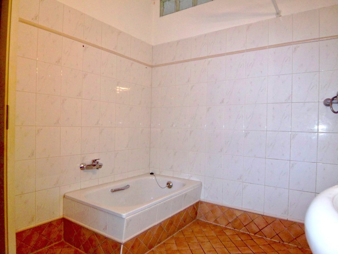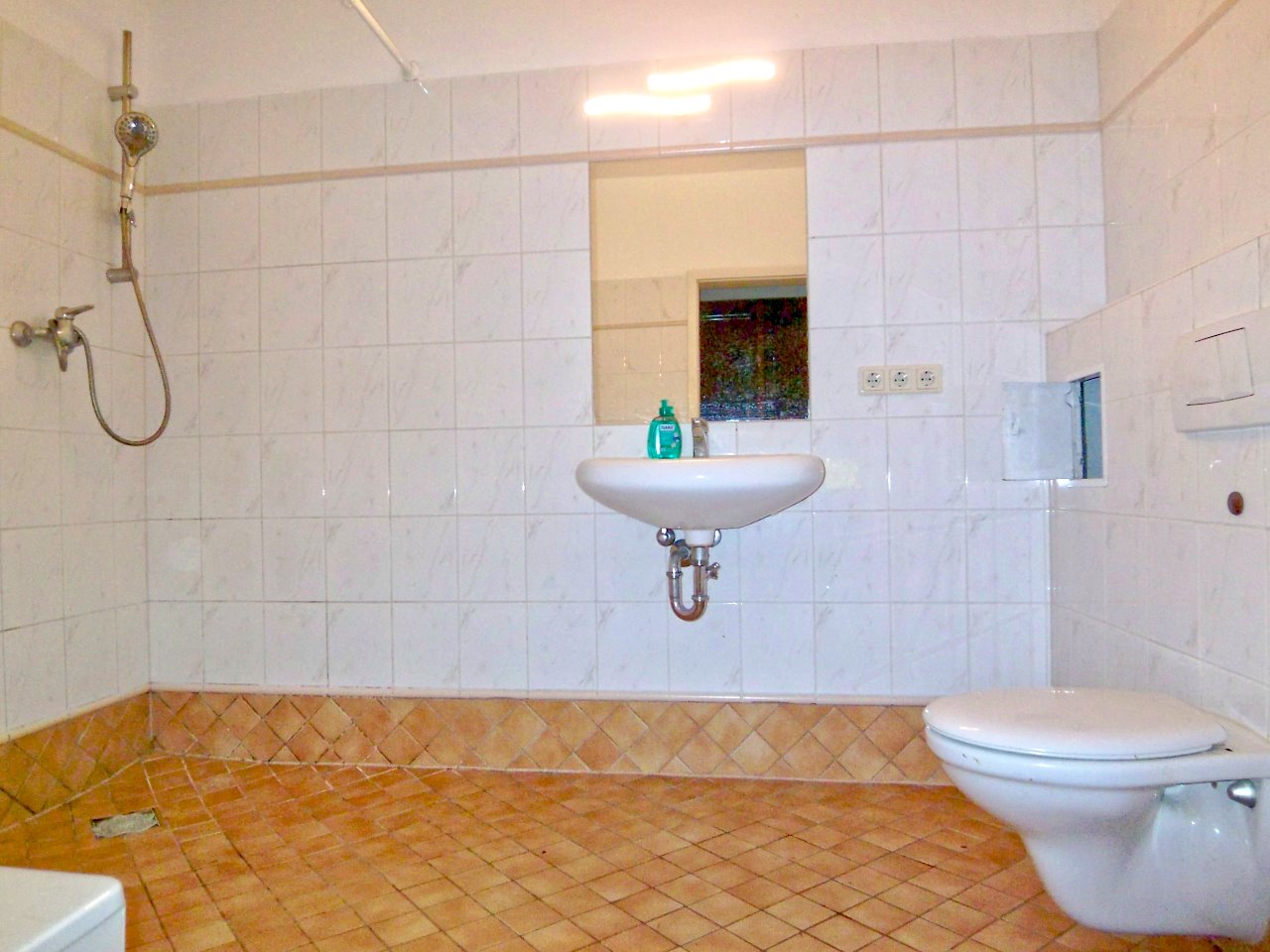 Bad mit ebenerdiger Dusche, kleiner Badewanne, WC, Waschtisch, WM-Anschluss, Flur