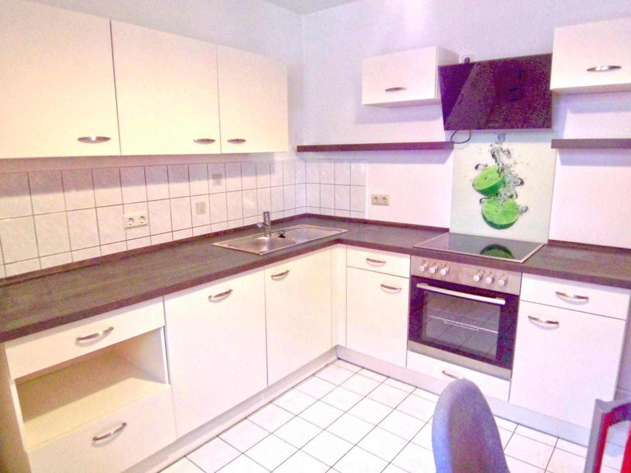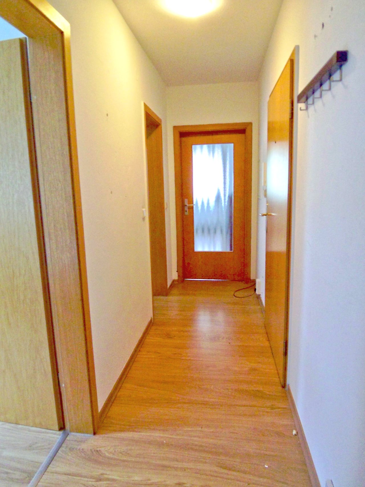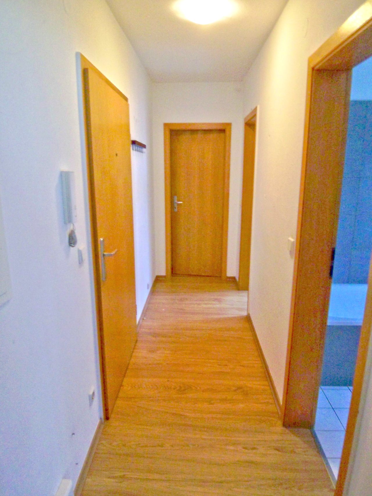 Laminat, Fliesen, alle Wände und Decken mit Putz und weißem Farbanstrich, Küche mit Fliesenspiegel, Gegensprechanlage, Kabel-TV