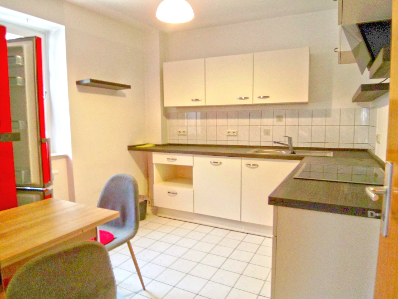 Wohnzimmer, Küche mit Einbauküche (VB), Schlafzimmer, Kinderzimmer mit Zugang zum Balkon (Blick in den Innenhof),