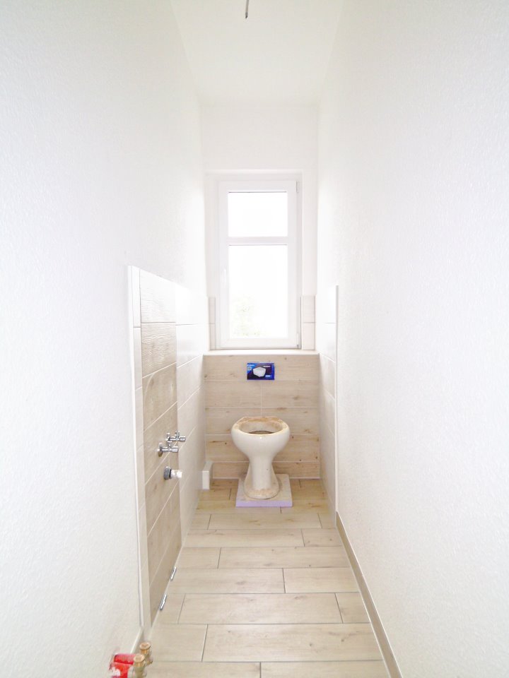 Tageslichtbad mit Wanne und Dusche, Waschtisch, Handtuchtrockner und WM-Anschluss, separates WC mit Waschtisch, große Diele